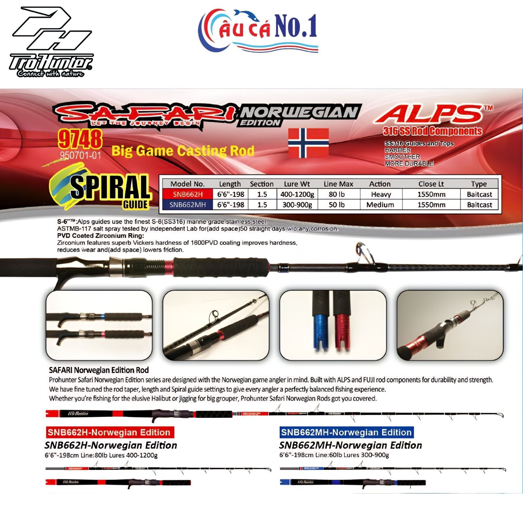 Prohunter Safari Norwegian Edition là dòng cần big game chuyên săn cá lớn, thiết kế dành riêng cho môi trường biển Bắc theo tiêu chuẩn Na Uy. Sử dụng khoen và phụ kiện ALPS – 316 SS siêu bền, chống ăn mòn tối đa, kết hợp cấu trúc Spiral Guide giúp ổn định lực và hạn chế xoắn dây khi chiến cá khủng.