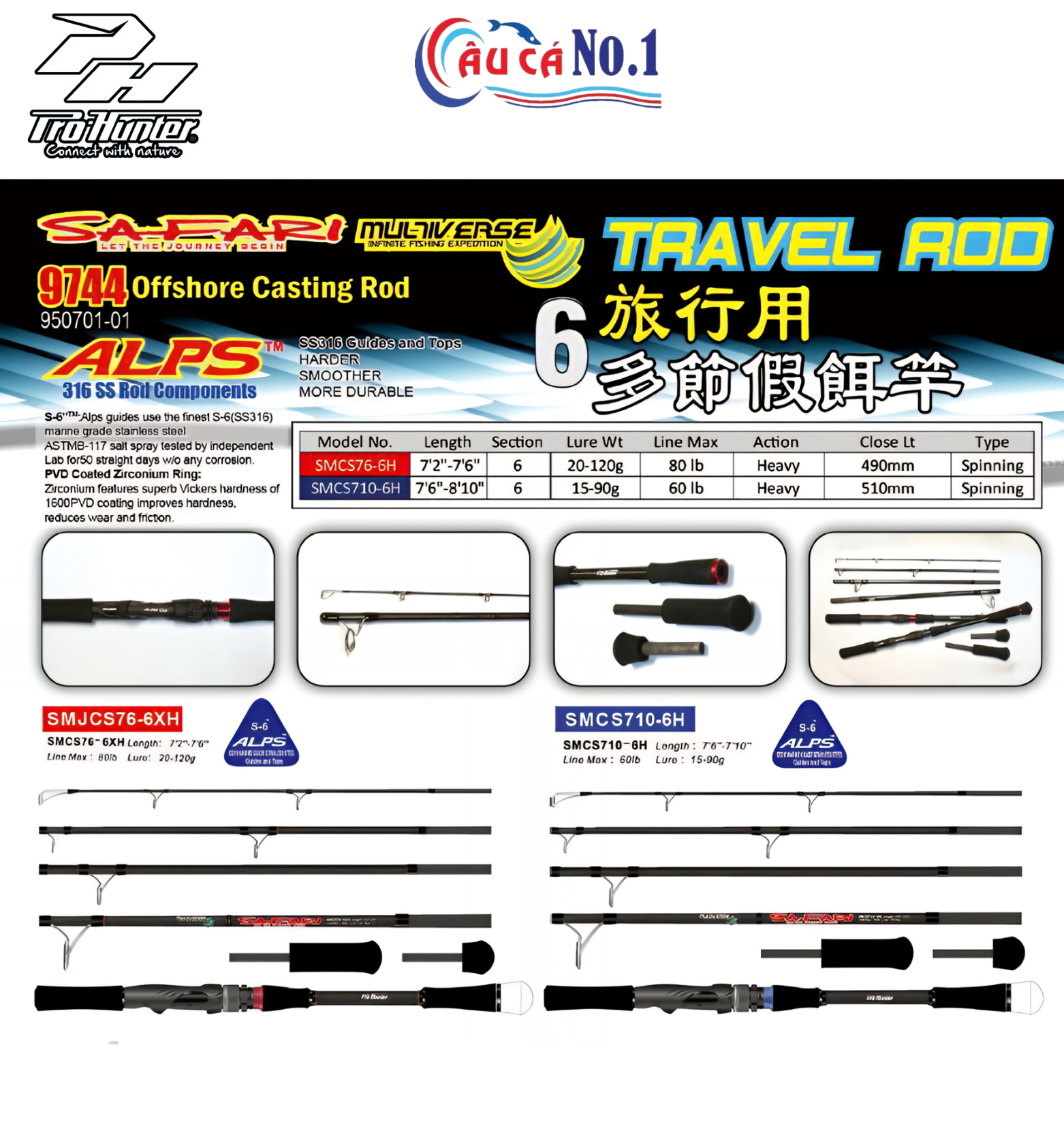 Prohunter Safari Multiverse Travel Rod là dòng cần du lịch 6 khúc cao cấp, thiết kế nhỏ gọn – dễ mang theo khi di chuyển, nhưng vẫn giữ được sức mạnh và độ cứng chuẩn câu biển xa bờ. Dòng cần sử dụng toàn bộ khoen ALPS SS316 – tiêu chuẩn chống ăn mòn cao nhất, siêu bền trong môi trường nước mặn.