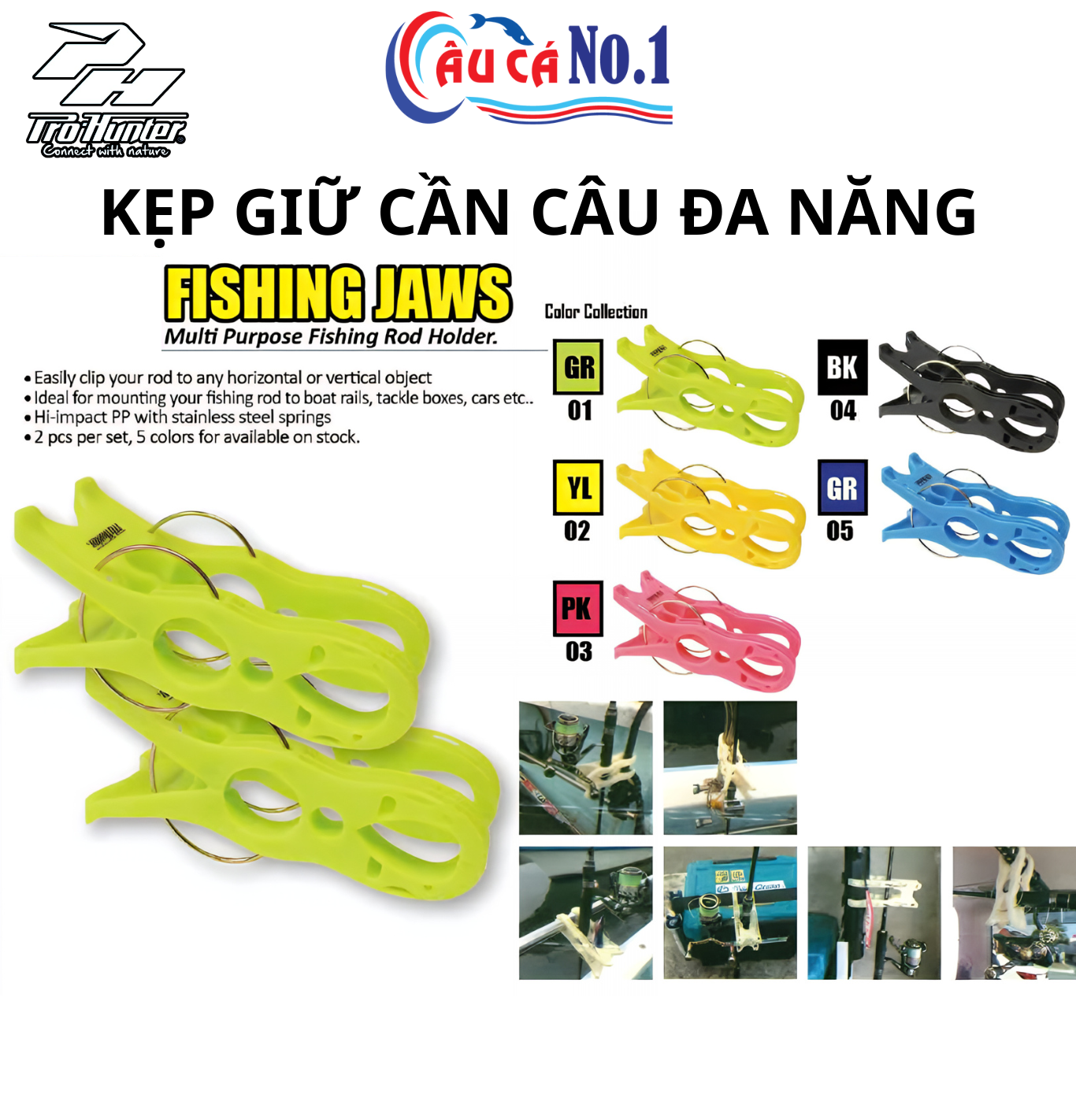 Fishing Jaws 6032 là bộ kẹp đa năng giúp cố định cần câu vào nhiều bề mặt khác nhau như thanh vịn trên thuyền, thùng đồ nghề, thành xe, hộp mồi… Thiết kế lò xo thép không gỉ và thân nhựa PP siêu bền cho lực kẹp mạnh, ổn định, không làm trầy cần.