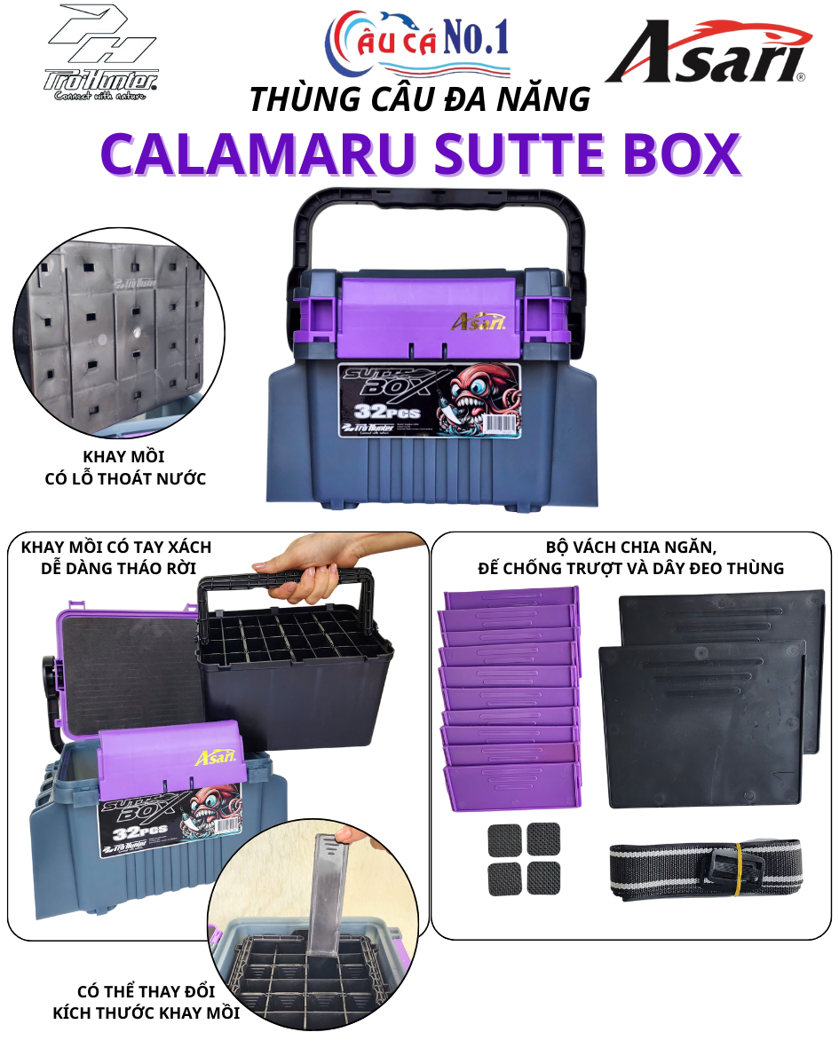 Asari Calamaru Sutte Box là thùng câu đa năng, thiết kế chuyên dụng cho câu mực và câu lure. Sản phẩm nổi bật với khả năng lưu trữ lớn, sắp xếp khoa học và tiện lợi khi di chuyển.